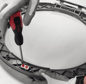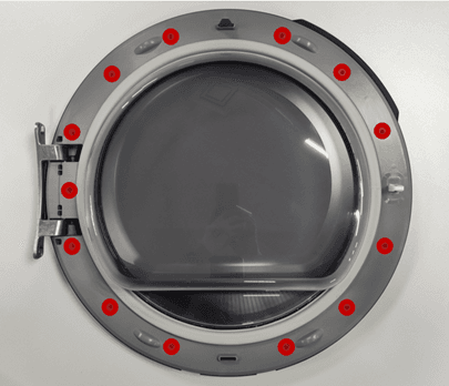 2. Afrouxe os 13 parafusos perimetrais que fixam a moldura interna da porta. Abra a porta com cuidado empurrando o elemento de vidro.